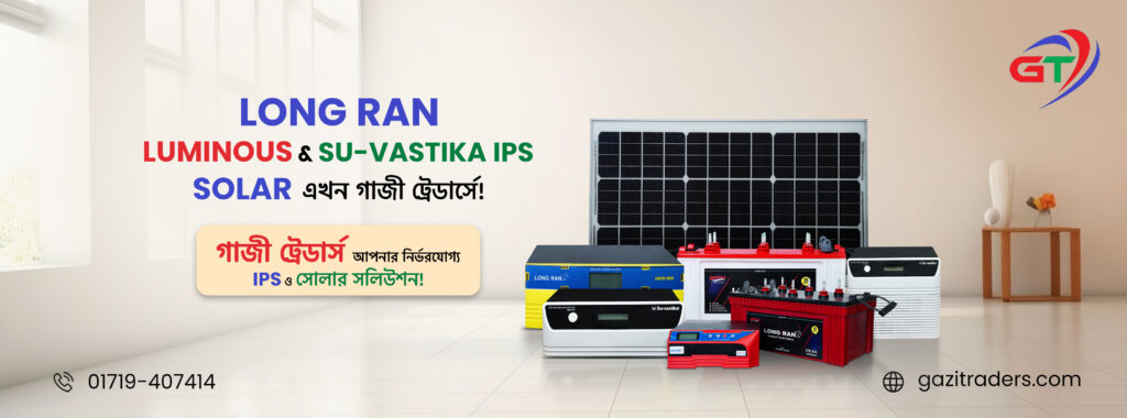 আইপিএস গাজী ট্রেডার্স স্বাগতম। আমরা বাংলাদেশে নং 1 সোলার ইকুইপমেন্ট সরবরাহকারী। আমরা আপনাকে উচ্চ মানের আমদানিকৃত পণ্য পরিবেশন করতে প্রস্তুত। আমাদের প্রধান পণ্য হল সোলার প্যানেল, IPS, UPS, অফ-গ্রিড/অন-গ্রিড এবং হাইব্রিড সোলার ইনভার্টার। EMI সুবিধা আছে।